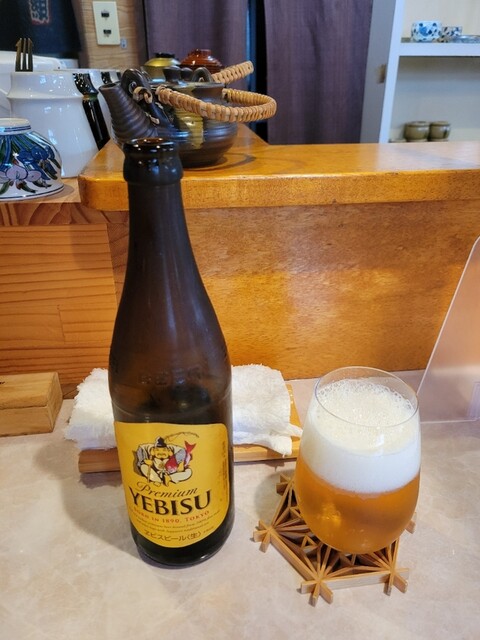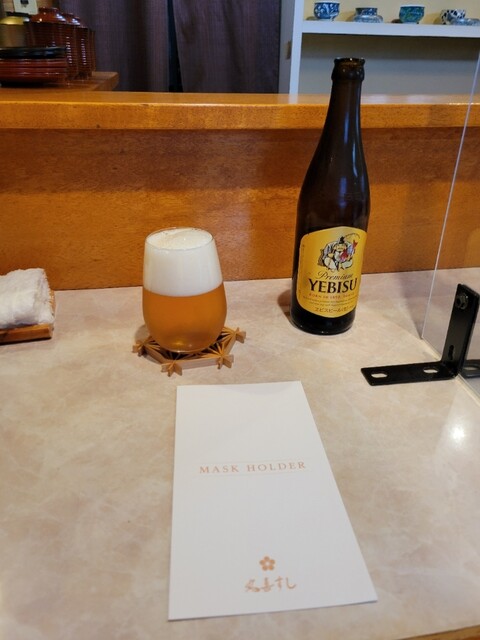 検温と手指の消毒を済ませ、まずはエビスビールを注文。女将さんがお酌して下さり、旨さが倍増(笑)
