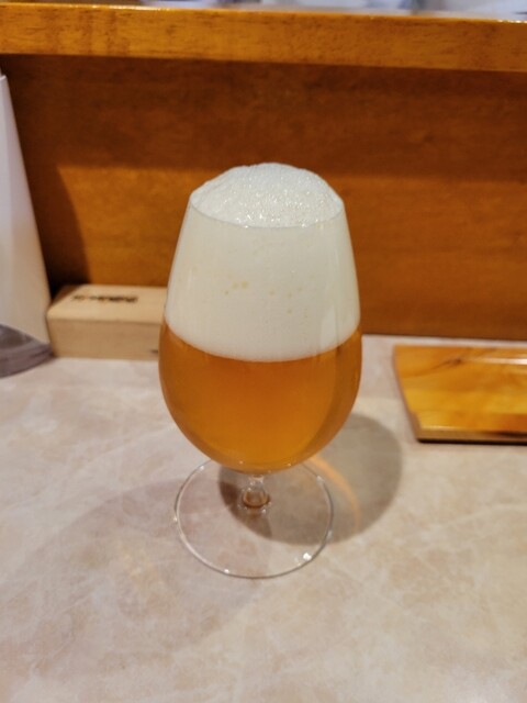 カウンターの左端に着席し、まずはビールで喉を潤します。この日は大将が注いでくれました(笑)