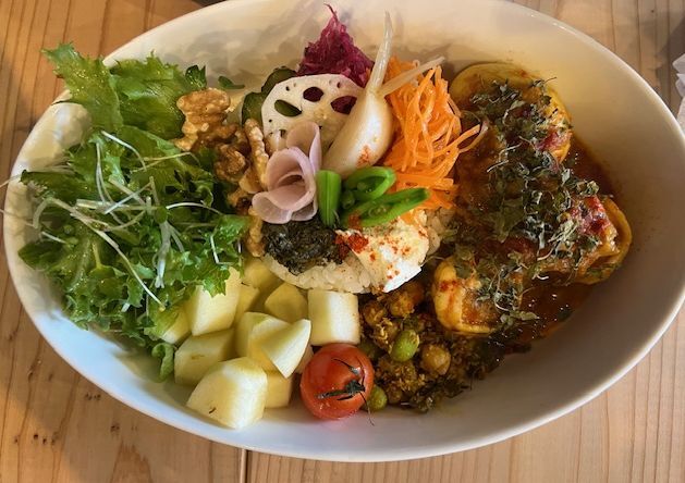 中央の黒いルーはかなりスパイシーなので要注意、ヨーグルトで中和させながら食べます