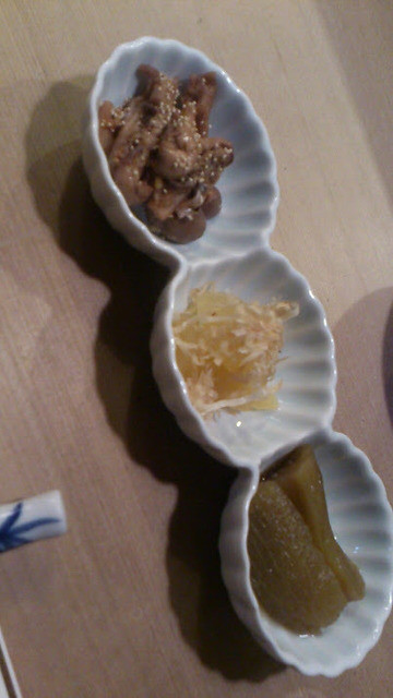 冷酒と共にきた突き出しは茄子のお浸しなど三種。