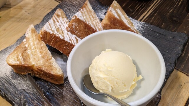 パンを炭火で焼いて、冷たいアイスをかけました。組み合わせが絶妙なデザートです。