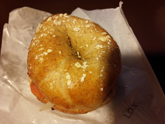「プレーンベーグルにサーモンスクランブルエッグをサンド」