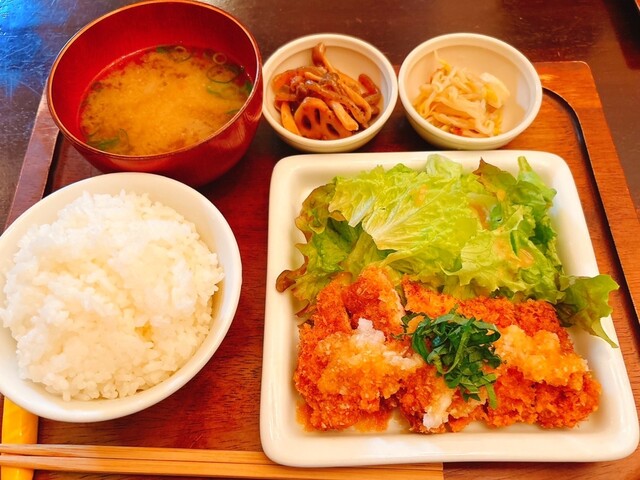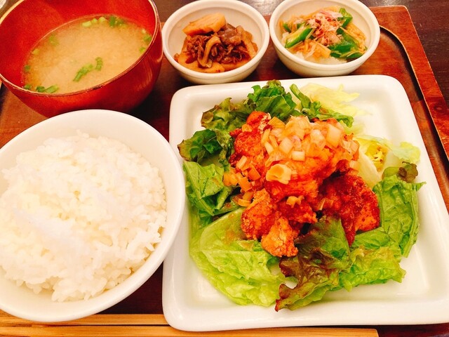 おかずの鶏のから揚げは、しっかりこんがり揚げられていて好みでした。酢の効いたネギタレが食欲をそそり、白ごはんが進みました。