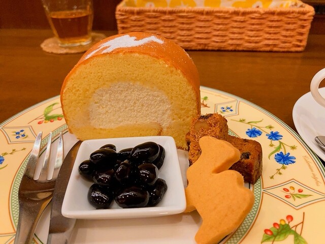 生クリームロールケーキ、黒豆、フルーツケーキ、おまけのらくだクッキー