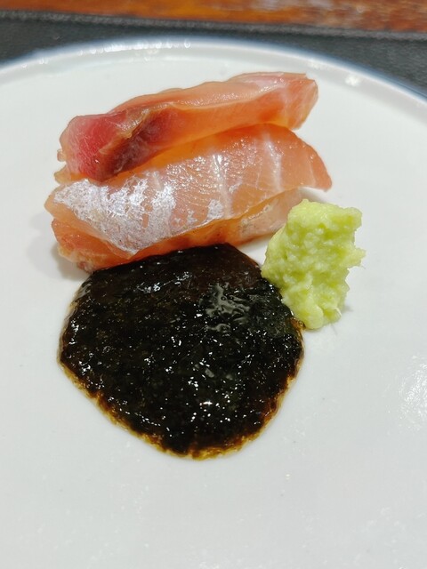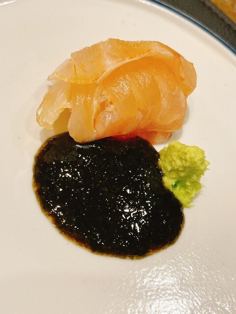 お魚の造りは、カンパチで10日間熟成!いつもの海苔とワサビで最高な組み合わせ