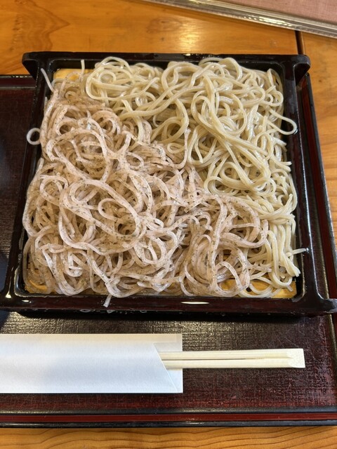 そしてメインは2色蕎麦(せいろと変わり蕎麦)をいただきました。本日の変わり蕎麦は「昼夜蕎麦」という、蕎麦の芯に近い部分だけで打った白い更科蕎麦(昼)と、抹茶で色付けした緑色の蕎麦(夜)を組み合わせて、昼と夜を表したお蕎麦とのことです。