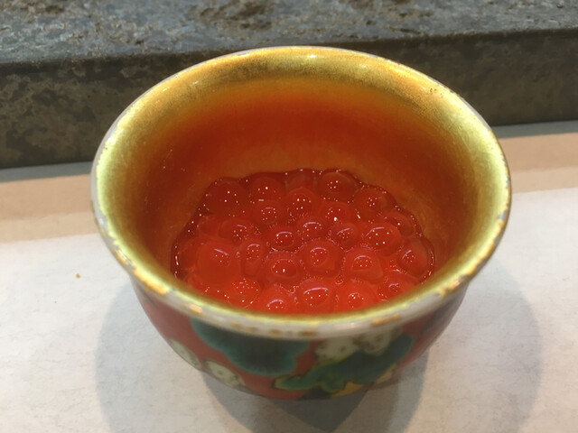 鮑、キャビア、蟹、鯛、白子、生からすみ、帆立、ヒレ肉、赤貝、みる貝、くじ、筍、トマト、いくら、蕎麦、さらにはご飯に至るまでよくぞまあ〜
