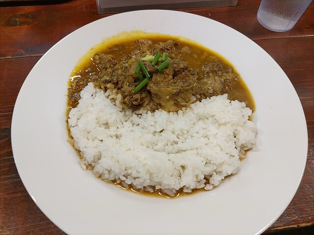 長い間休業されていましたが,ある日突然再開されてました。のぞいてみると昼時にもかかわらず先客ゼロ,営業中の表示を確認して入店です。メニューを拝見すると牛すじごはんのカレー,ブラウンソース,アジアンソースの3種類で各々レギュラーサイズ,オムレツのせ,オムチーズのせがありました。この日はカレーという感じではなかったのでハヤシライスと思われるブラウンソースのレギュラーサイズを発注,900円。5分ほどで供されました。早速いただいてみるとよく煮込まれた牛すじ肉がほろほろになっていて,酸味控えめなブラウンソースがよくごはんにからんで大変美味しいものでした。ごはんはやや多めに感じましたので250gあるかもしれませんが美味しかったので完食です。