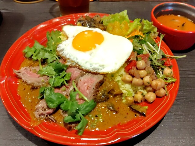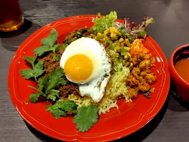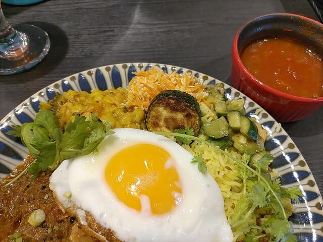この日は,スパイシーキーマカレー,赤ワイン仕込みのポークカレー,エビカレーがありまして,スパイシーキーマカレーをお願いしました。副菜は,なすのアチャール,ココナッツキャロットラペ,アボカドサラダ,ひよこ豆のカチュバル,ズッキーニサブジと盛沢山で,更に供されたお皿にはいつもはないパパドも付いておりました。いつものように目玉焼きを一気にいただいて,全混ぜ方式でいただきます。パパドは砕いて,ラッサムは粘度高めでしたのでこれも一緒に混ぜていただきました。全混ぜはいろいろな味わいが感じられて面白いですし,美味しいです。何度いただいてもこちらの一皿は印象深いと思います。ブログ記事から投稿しました。https://datte2.hatenablog.com/entry/2025/07/25/020000