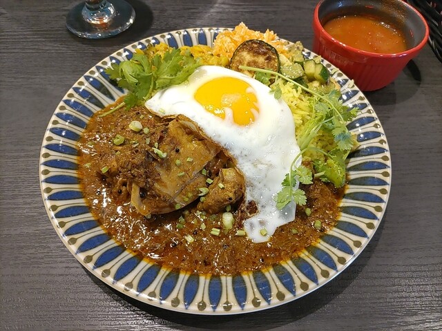 店頭のA型看板のメニューが気にはなっていたものの,間口が狭く,中の様子が窺えないこともあって,入るのを躊躇っておりました。この日は思い切ってドアを開けてみればカウンターと高いテーブルの確かにバーな雰囲気のお店で,女性店主のワンオペの様子。カウンターに座って,メニューからスパイシーキーマカレーを発注,1000円。注文時にパクチー添えて良いか聞かれました。カレーなのに結構時間かかるなと思っていたら出てきたものをみてびっくり。黒板メニューにポリヤルやら目玉焼きやら何やらと副菜が書いてありましたが,当然別注文と思っていたら標準品でした。米は長いバスマティでスープはラッサムと何やらインネパ専門店を思わせるものでした。目玉焼きだけ最初にいただいて,あとは例によって全混ぜしていただきました。思ったとおり,辛ささほどでもありませんが,深みというか広がりがあるスパイシーさで大変美味しい。また,すっぱ辛いラッサムもこのカレーに合います。食後にはフルーツライタも出ました。こちらのカレーは専門店といっても良いのではないかというもので大変美味しくいただきました。ブログ記事から投稿しました。https://datte2.hatenablog.com/entry/2023/08/01/040000
