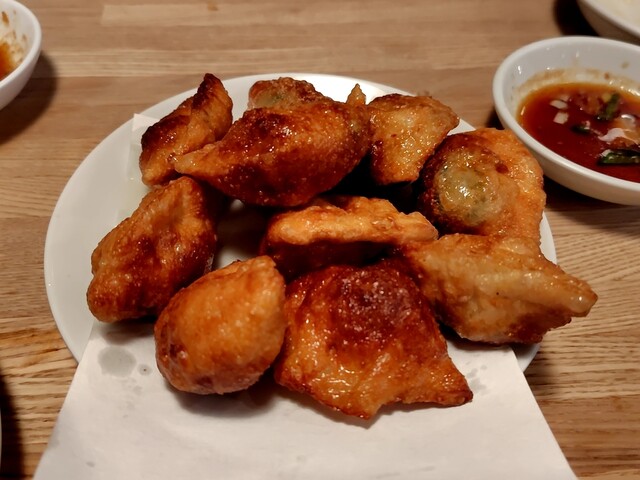 20年以上前から評判は聞いていましたが,なかなか機会に恵まれず未食でした。今回,行ってみようという話が持ち上がり,予約取っていただきました。入口判り難いビルの2階です。以前はもっと駅の近くにあったように思いますがどうでしょうか。既に予約満席の表示があり,店内も満席です。90分制だそうで,予約時刻の10分ほど前に着きましたら,前客さん食事中で早かったようです。注文は餃子が焼ける前にと思ってねぎチャーシュー,水餃子,焼餃子,揚餃子を各1皿。ねぎチャーシューは厚切りチャーシューがドンと乗っていてチャーシューそのものが美味しいです。こちらの餃子は挽肉でも粗みじんでもなく,食感ごろごろの小塊状の豚肉,これにねぎ,にら,きゃべつ,生姜あたりが入った餡は初めてです。餡は水・焼・揚で共通かと思いましたが,いただいてみると例えば水餃子は生姜が効いてというように少し異なる感じがしました。水餃子はもっちり皮と生姜餡,焼はパリパリ皮にジューシー餡,揚はカリっと皮にしっかり餡といった感じです。出色なのはお店調合のたれで酢醤油ベースで辛味も入っているものでねぎたっぷりでいただくと餃子に絡んで美味しいです。不思議だったのは餃子の数で,メニューには一皿9個と書いてありましたが,10個入ってきておりました。今回3人で行きましたが,各餃子ひとり3個で丁度のはずがひとつ余るので誰かが食べていないのではないかと疑いましたが,10個のってきていただけでした。更に各餃子を1皿ずつ追加して,焼売もお願いして満腹になりました。確かに唯一無二の餃子でした。ブログ記事から投稿しました。https://datte2.hatenablog.com/entry/2025/02/08/020000