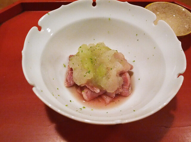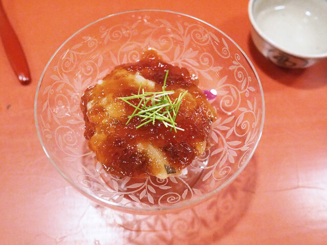 中のほぐし身は蟹味噌和え、キャビアとジュンサイ、いちじくを添えて。蟹といちじくの合わせがよい。わたしはひょっとすると、果物の中でいちじくがもっとも好きかもしれない。甘みがギラギラしていなくて、楚々としている。蟹身に上品な甘みを添えている。そこにジュンサイが潤味(うるおみ)を与え、最後に少量のキャビアの塩味が全体をきゅっと引き締めている。最初の一品目として秀逸だ。