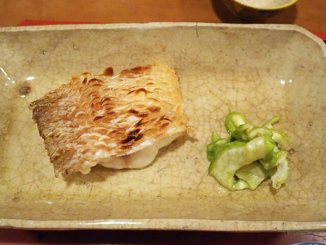 「祇園 大渡」さんの松かさ焼きは、皮目からあふれる脂の具合といい、焼き目の香ばしさといい、身肉(みしし)のふくよかさといい、申し分のない職人の仕事であった。脇には、雷干し(かみなりぼし)が添えてある。白瓜のつけものである。