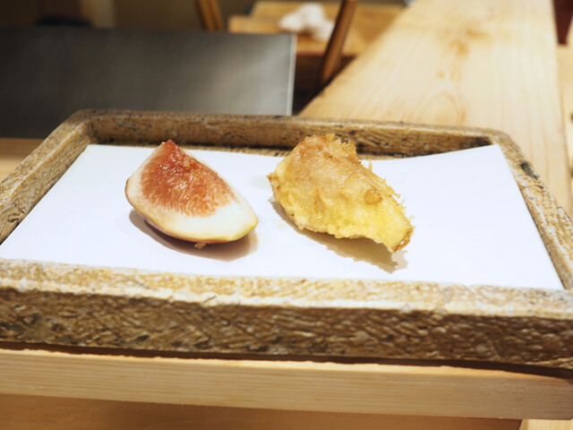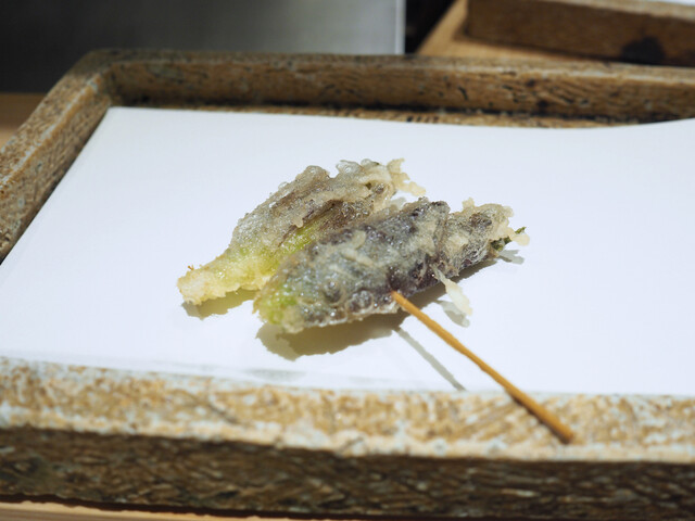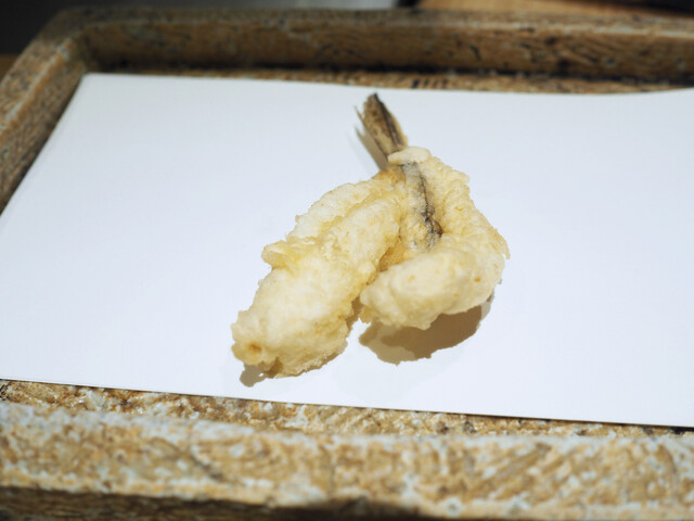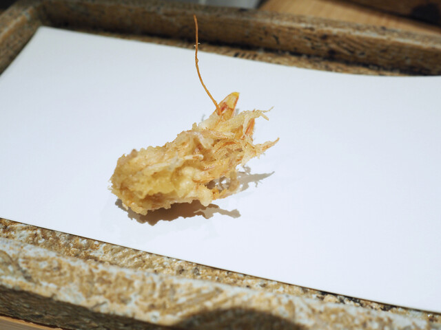 続いてこれを揚げて饗される。これが驚きの出来栄えであった。身肉がジュース(液状)と化すのだ!こうして生との食べ比べをいただくと、天ぷらという技術の凄さが際立つ。素晴らしい演出である!