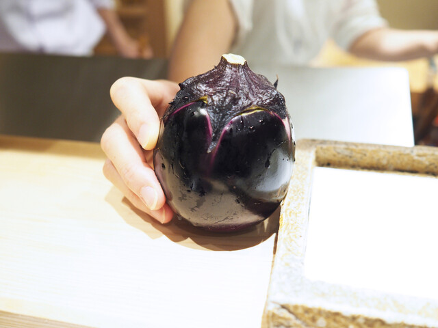 徳川家康に献上していたという記録が残る「折戸なす」。これをまず生で塩でいただく。全く灰汁がなく身がしまっている。でも、生で食べるそれはまるでマシュマロのように軽い。
