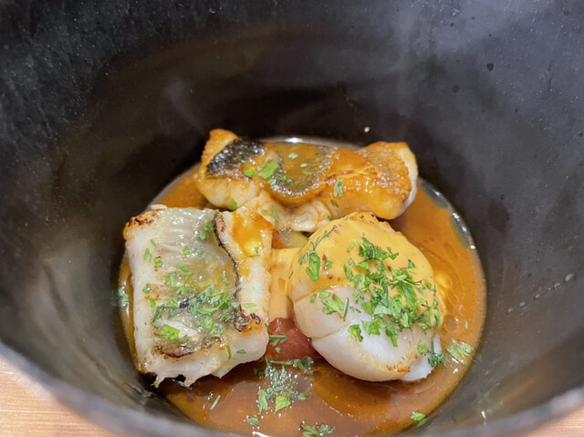 ブイヤベース。香ばしく焼いた魚介に、魚介の旨味が凝縮のソースを合わせて。