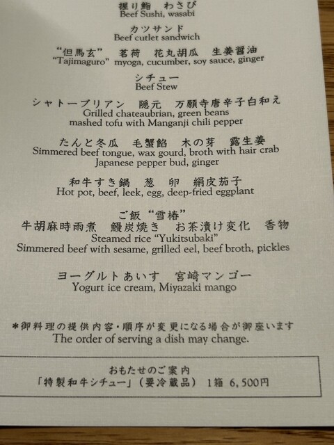 和牛コンソメと雲丹から始まり、握り、分厚いカツサンド、シャトーブリアンなどどれも適度なサシが入っていて、くどく無くて、完食できました。