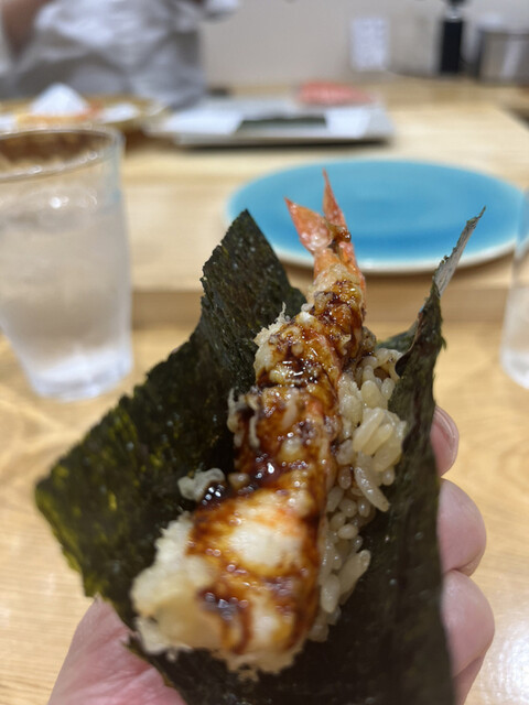 目の前で揚げていただくというのが醍醐味で、まさに揚げたてをいただきます。ほわほわの衣に優しい海老の食感、甘めのタレを海苔で包み込んで、思い出してまたよだれがでてきちゃうレベルです。