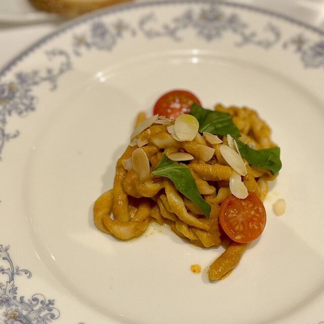 豆の旨不思議スープ、吾輩好適太麺ウンブリチェッリ(ほぼトスカーナのピチ)、ロッカフィオーレの花マーク模したラビオリ。