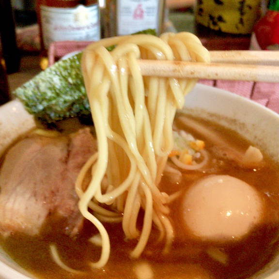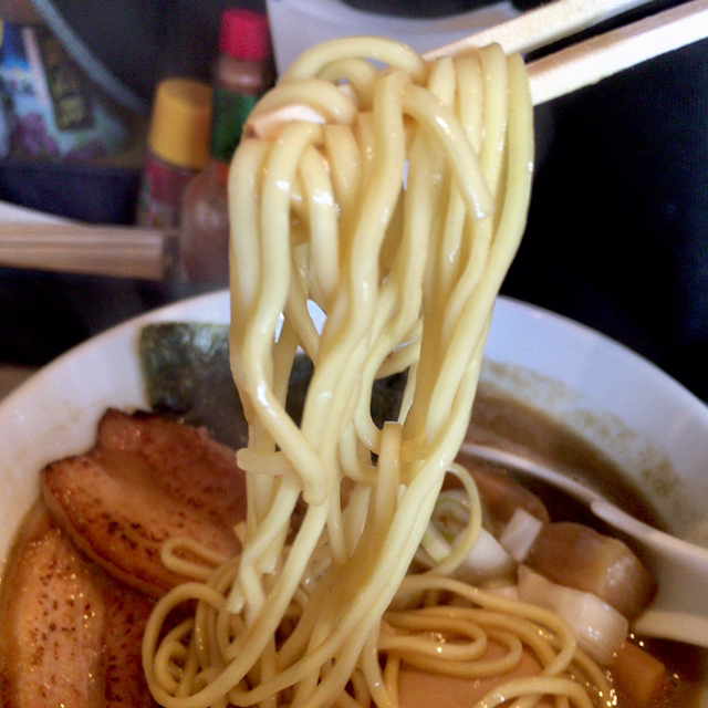麺は中太ストレート。(味とは関係ないが、スープ内での収まりがもっと揃ってたら更にGOODかも。今日のは静かに手繰ってもスープが跳ねまくった^^;)