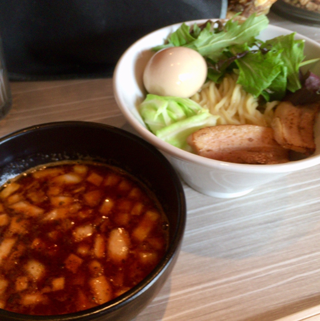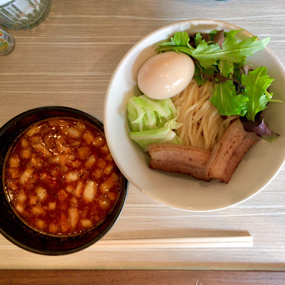 つけ汁側には、刻み玉葱がIN。他の具(汁麺と同じ)は、麺鉢側に盛り付けてある。