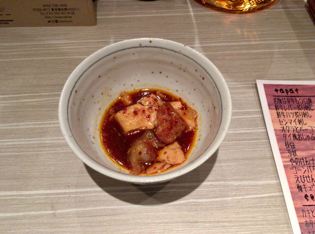 お通しは、店の名物だという牛モツと豆腐を甘辛に煮たもの。レギュラーメニューにもあり、追加注文したくなる美味さ。