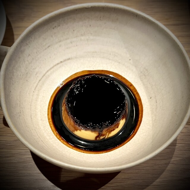 〆にプリン。添える浅煎りコーヒーよりビター感強いカラメル。口内での再構成がエンターテイメント。