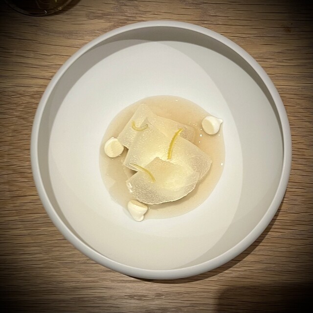 ・薄切り梨(南水)とレモングラスのアイス、レモンピール、メレンゲ