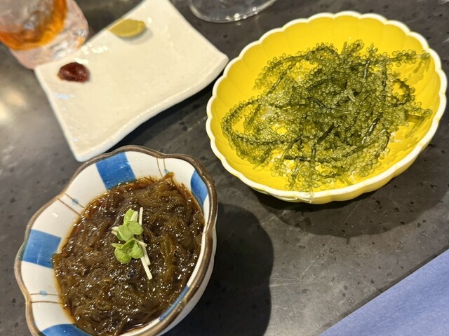 はじめにもずく酢と海ぶどうが出てきましたが、もずく酢のタレがまろやかで、ものすごく美味でした。海ぶどうをそのタレにつけて食べて、二度美味しかったです。