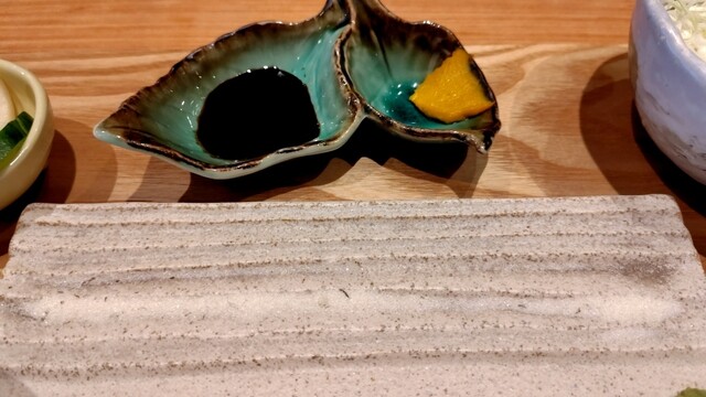 お茶を飲みながらしばらくすると料理が出され、まず一目見て「うん、綺麗だァ、柔らかそう」と好印象。食べ方の説明があり、塩、わさび、カラシ、ソース、唐辛子をそれぞれ変えながら実食。