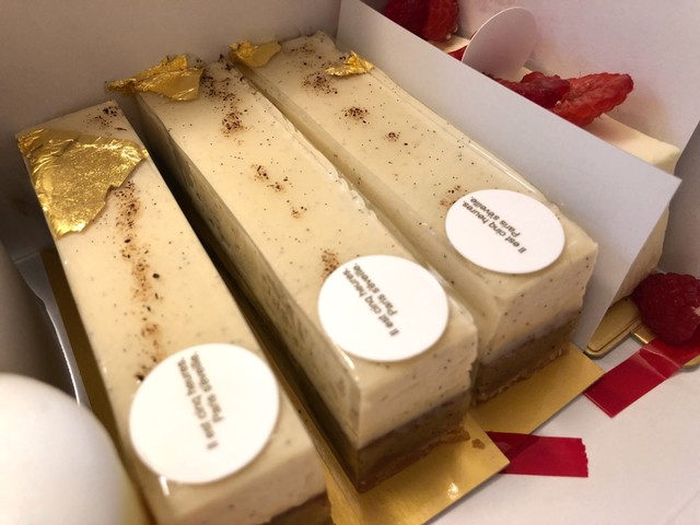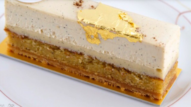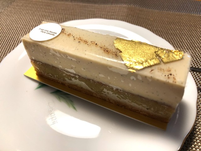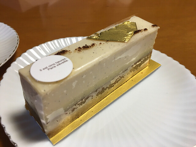 長細く、上には真っ白なバニラビーンズたっぷりの金紙がのった見た目も豪勢なケーキ。