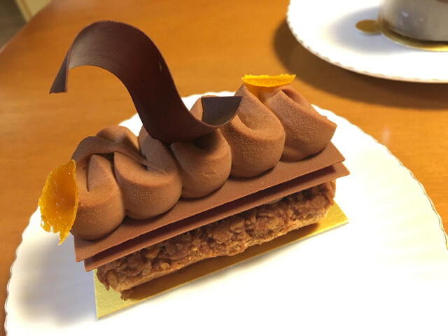 ヘーゼルナッツのダックワーズにチョコプレートを重ねた見た目も複雑なケーキ。