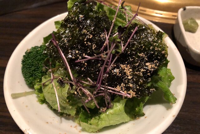続いてキムチ盛り合わせ、これも普通に美味しいです。サラダは韓国のりと紫色のカイワレの乗っかったもの。量の割に皿が小さくて食べにくかった!笑