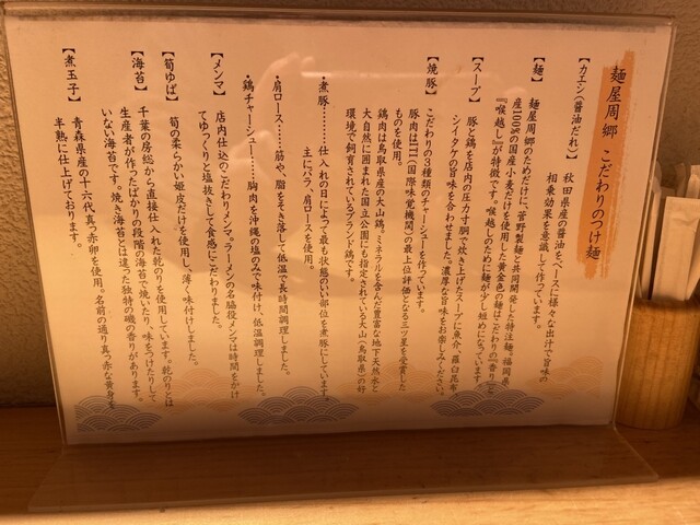久しぶりに美味しいつけ麺に出会えたと感動した。大山鶏や研究し尽くされた焼豚煮豚はほんとうに柔らかく美味しくて。めんまも筍も柔らかくて美味しくて。全てがどタイプストライクでした!!!