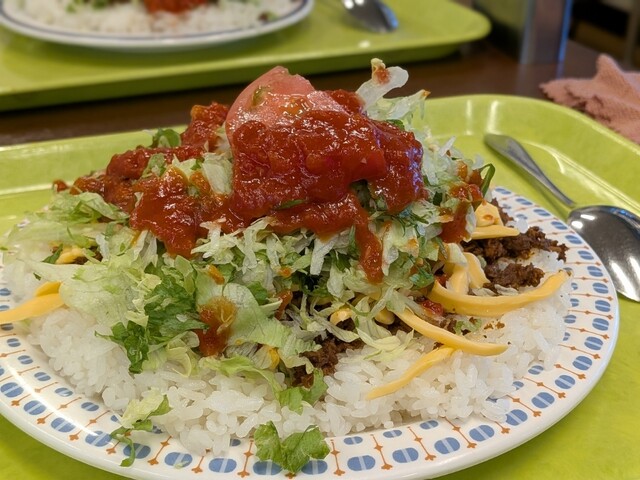 タコライスチーズ野菜950円をオーダー。すべてが盛り盛りでうれしくなります。ソースもかけ放題♪沖縄本島に来たら必ず食べたい逸品です。那覇市内にもできないかなぁ。