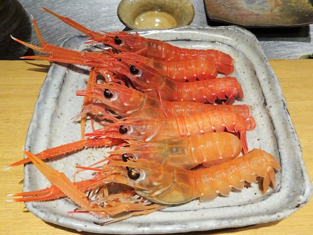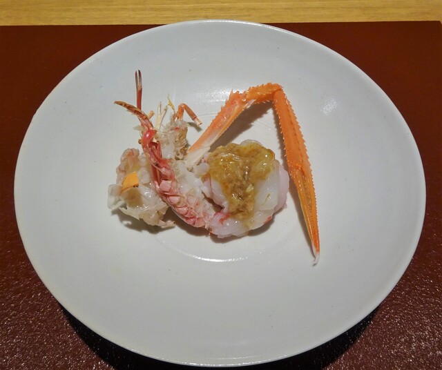 赤座海老:お造りと脚の炙り、海老味噌がけ