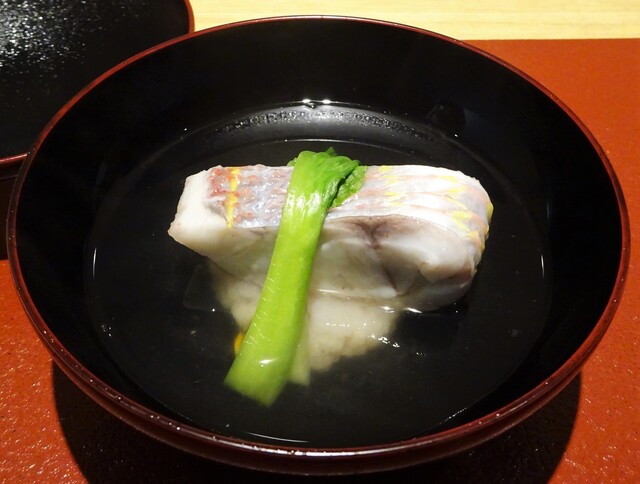 お椀:いとより鯛、蓮根饅頭、小松菜