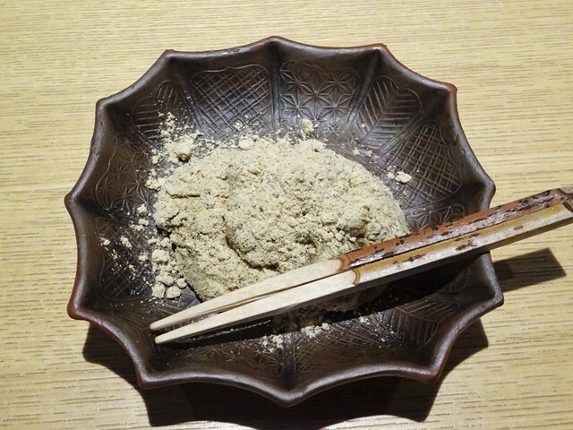 甘鯛を味わっている時、藤岡氏は焙烙で白胡麻を煎り、擂鉢で擂り胡麻の準備。