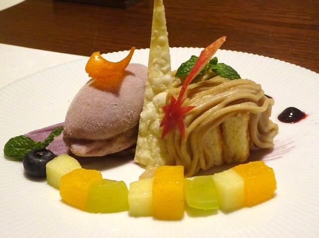 マロンペーストをかけたスポンジケーキ、巨砲アイス、フルーツ、ブルベリーソース。