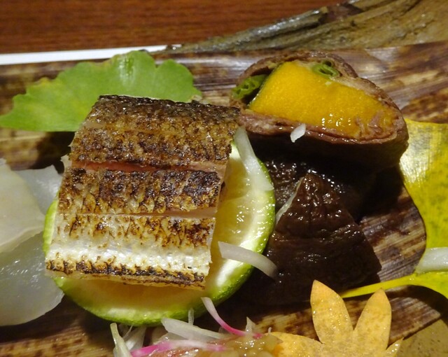 夕食:向付(カマス炙り、南瓜と葱の牛肉巻、もろみ味噌、干椎茸の煮物)