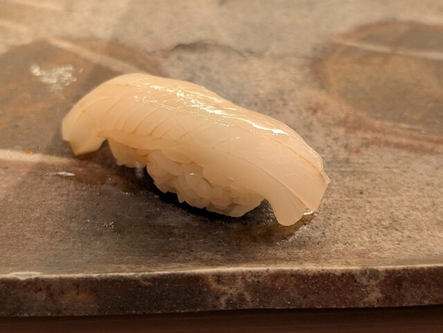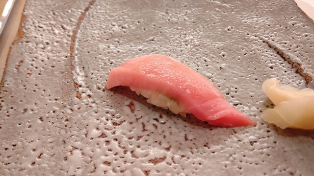 板前さんおすすめのにぎり18貫、お椀、デザートのセット。今回のネタは、まぐろの赤身漬け、平目、まぐろの背トロ、真鯛の砂ずり、赤貝、新イカ、新イカのゲソ、まぐろの大トロ、真鯵、車海老、エンガワ、石垣貝、縞鯵、ミル貝、いくら、雲丹、まぐろの大トロハラモ、まぐろの炙りトロ、穴子、玉子と、んっ?・・・レビューを書きながら、まぐろの赤身漬けから玉子までを数えたら20種ありました。妻の誕生日祝いにサービスしてくれたのかなぁ。まぐろは釜石の本まぐろで、赤みは程良い酸味を感じる美味しい赤身でしたし、大トロに大トロハラモは脂の乗りが良く言葉が出ない旨さ。時期的に最終であろう新イカや石垣貝などの貝類も美味しいかったです。雲丹は佐賀産で、粒がしっかりしていてクセのない甘味がある美味しい雲丹でした。この内容で8000円は安いですよね。