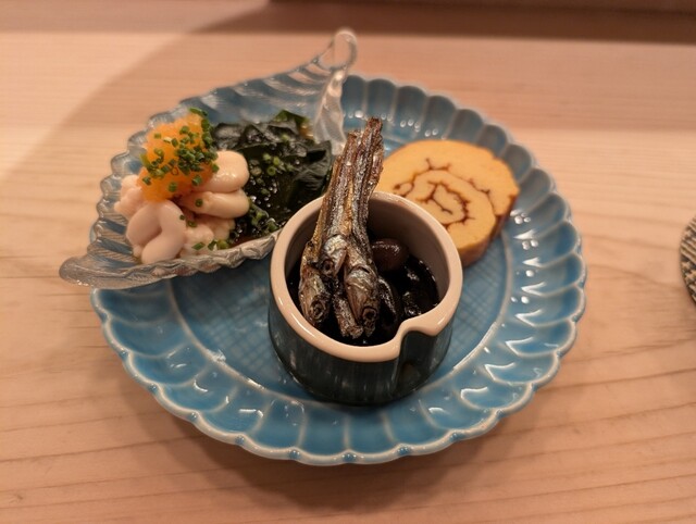日本酒のアテに小肌をお願いしたら、小肌、刻んだガリ、細切りのキュウリ、大葉を海苔で巻いた一品が出てきました。酢締めされた小肌、ガリとキュウリ、大葉の爽やかな香りが良い、お酒が進む料理でした。