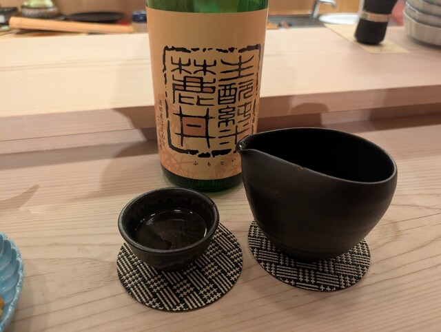 開店時間に合わせてお邪魔すると、開店当初からいらっしゃるスタッフ2人が迎えてくれて新年の挨拶。カウンター席に座る前に板前さんと挨拶。「そういえば、お正月の期間にお邪魔するのは初めてだなぁ」なんて話をしながらおすすめの日本酒でスタート。