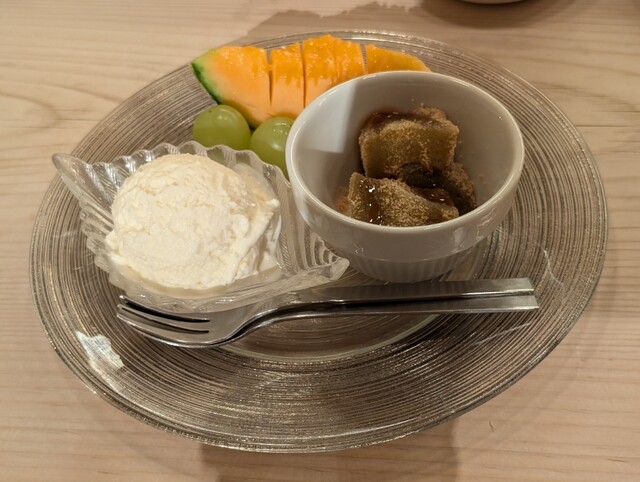 デザートは自家製のパンナコッタに完熟キウイとバナナが添えてあります。こちらでデザートをいただくと、昔14時から17時までやっていた甘味処お福さんで出されていた和風パフェやあんみつなどが食べたくなります。