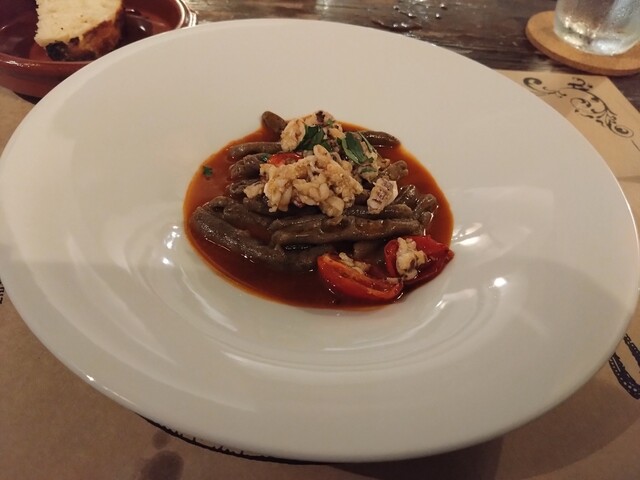 大津港のシャコとナスの皮を練りこんだチカテッリ