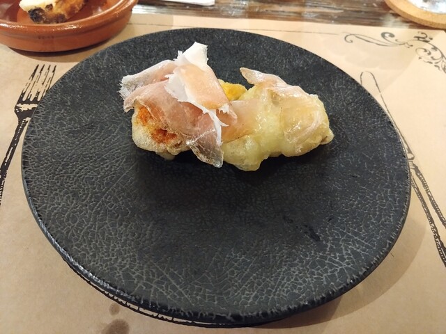 卵茸とウスムラサキホウキ茸のフリットとロンツァ