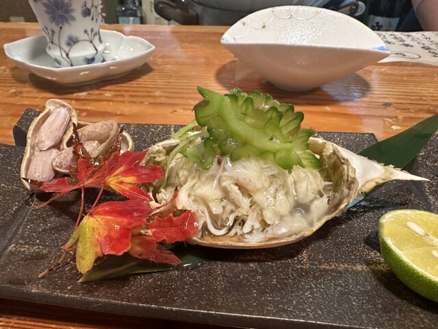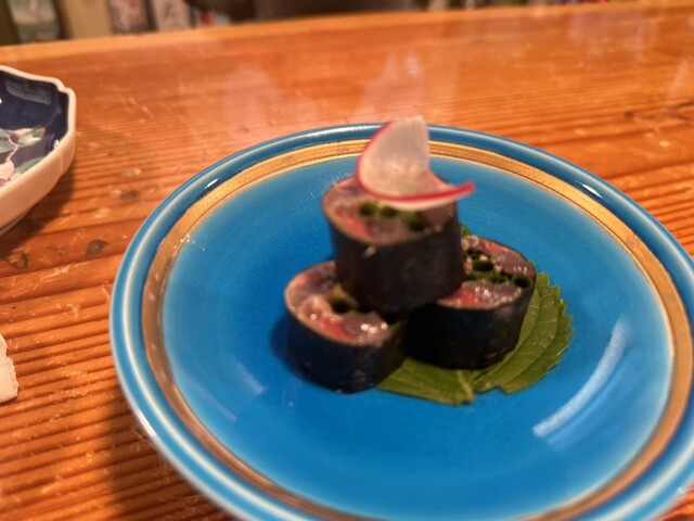 突出しに秋刀魚と梅の巻物。秋刀魚も脂が乗って梅との相性も抜群。ガニ漬け(ガンヅケ)は、干潟に生息する小型のカニを利用した塩辛の一種とのことですが、甲羅の食感がガシガシと。日本酒が飲みたくなって、佐賀のお酒の七田とともに。
