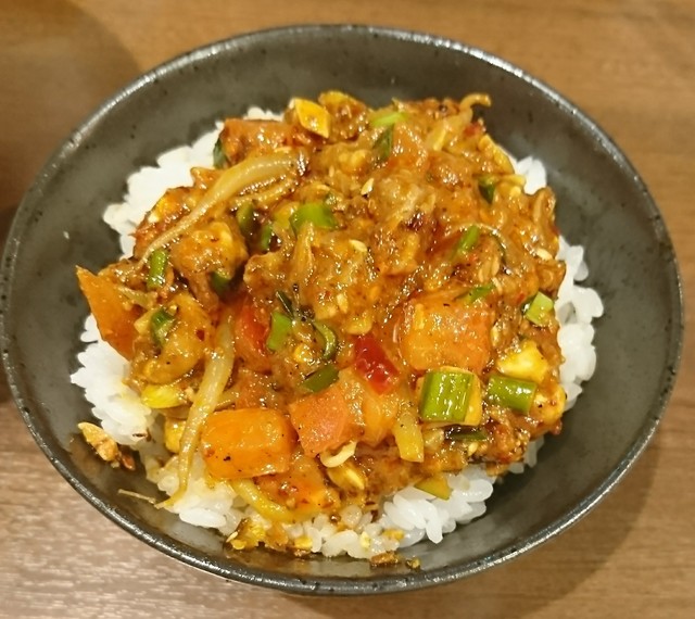 「生ラムクミン炒めカリィ」「四川麻婆豆腐カリィ」と今月の限定「スペアリブ」を含めた3種あいがけを「天津カリィ炒飯丼」にONさせた我が儘ハイカロリーな丼ぶり。