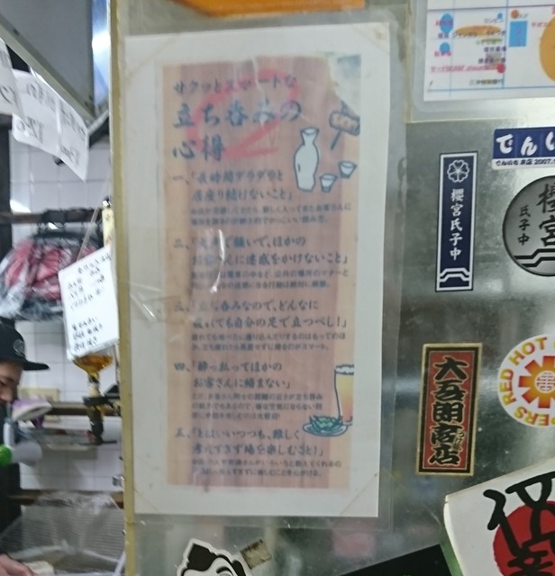 そして、この店の良いところは酒と旨い肴とCPの良さだけでは無く、大将の人柄と安心して飲める店の雰囲気の良さで、老舗の立呑屋は閉鎖的な雰囲気の店が多いですが、こちらの大将は初訪者大歓迎ですし、また大将がきちんと客と店を管理しているので、かなりバラエティーに富んだ客層ですが、皆一定のマナーを守って楽しく長居する事もなく上手にお酒を飲んでいます。