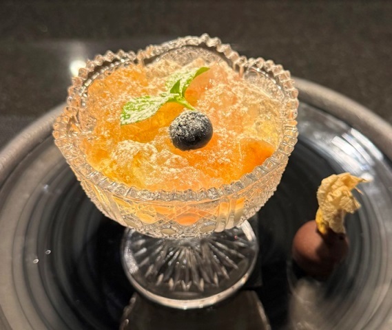 桃のコンポートとシャンパンゼリーがのっており、横にはチョコレートでコーティングされたホオズキが添えられています。